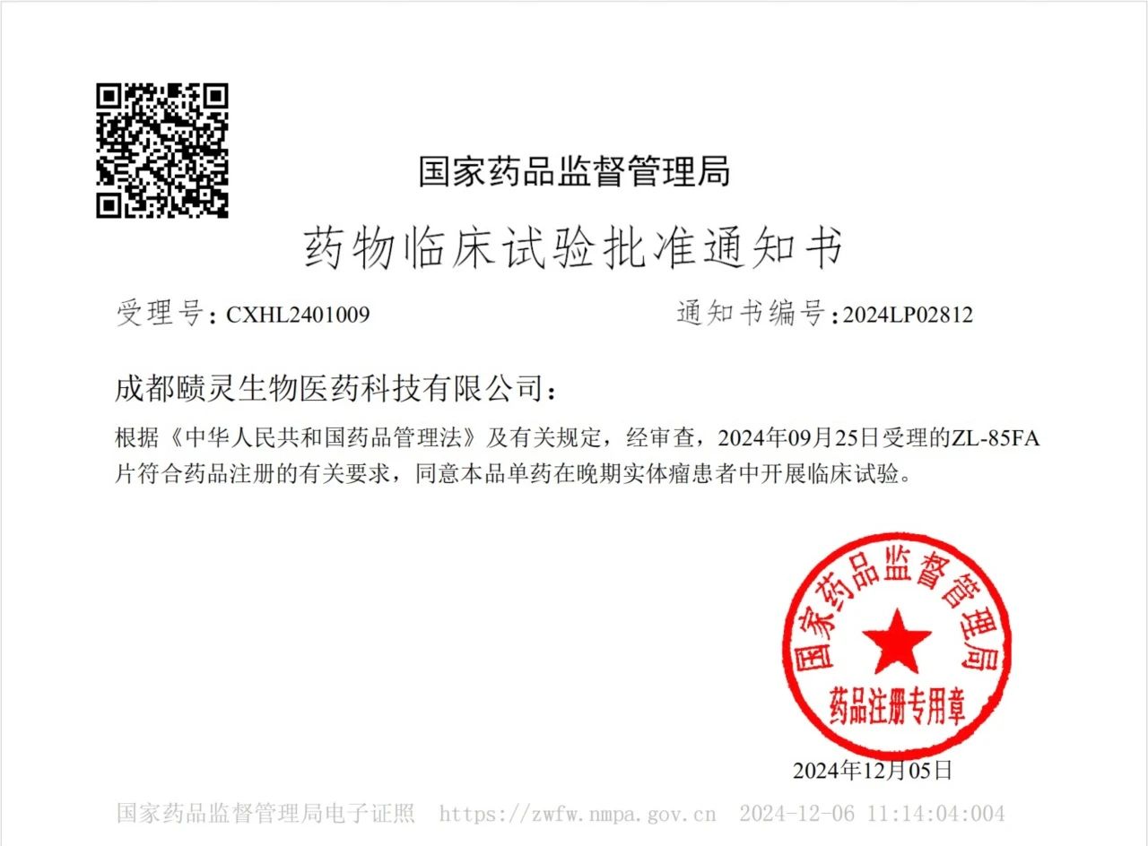 值得一提的是,美国血液学会(ASH)年会开幕前,赜灵生物ZL-85FA片成功获得晚期实体瘤临床批件。
