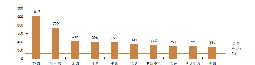 图3 2021年全球各国(地)机器人密度(万人/台)